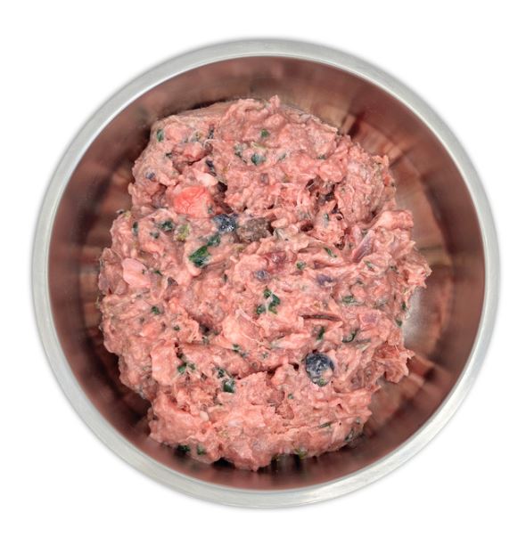 A single recipe box containing chicken muscle meat with pork and beef organs, mixed with a unique XL blend of low-glycemic fruits and vegetables. A good base for your dog's raw diet and a great option for multi-dog households.