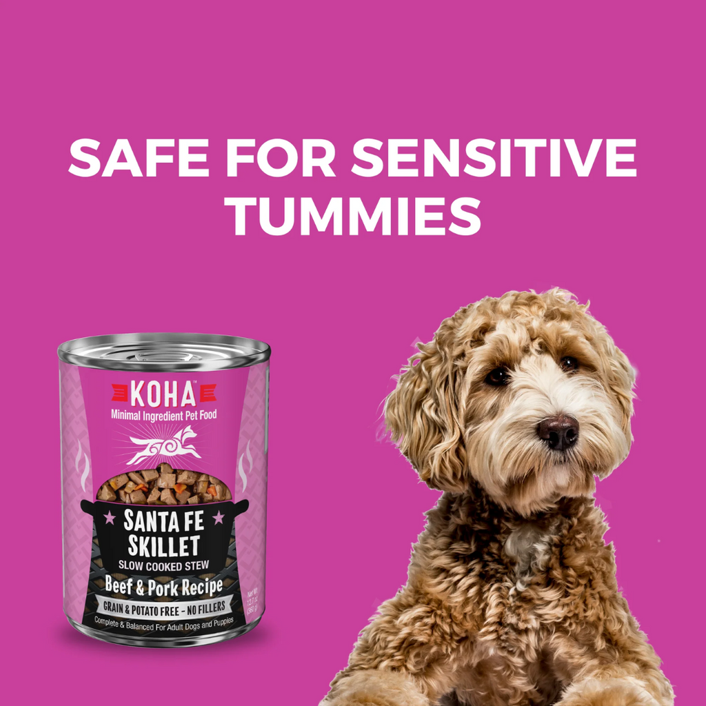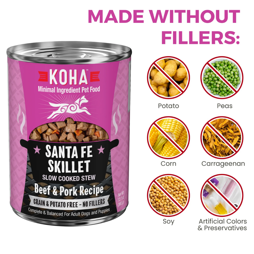Make mealtime exciting with Koha Santa Fe Skillet Slow Cooked Stew. Your dog will enjoy the savory taste of beef & pork in a moisture-rich stew inspired by the Southwest. With no junky fillers like peas, potatoes, or corn that can lead to digestive issues, these slow cooked stews are easy to digest and ideal for picky eaters.