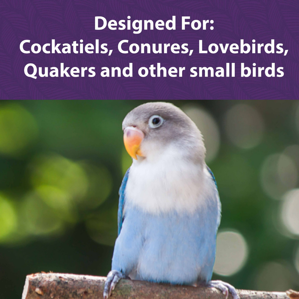 Mazuri Small Bird Diet is a complete bird food that is designed for cockatiels, conures, lovebirds, Quaker parrots, and other small birds. This bird food is nutritionally complete and comes in multi-sized particles. It can be the primary diet for non-breeding birds. The mixed particle sizes and shapes provides enrichment. Also, the extruded form prevents the sorting of ingredients and helps support optimal nutrient uptake. You may provide additional species-appropriate food items, such as produce, seeds, etc., and can include up to 20% (by weight) of the diet. This bird food contains no added colors or artificial flavors.