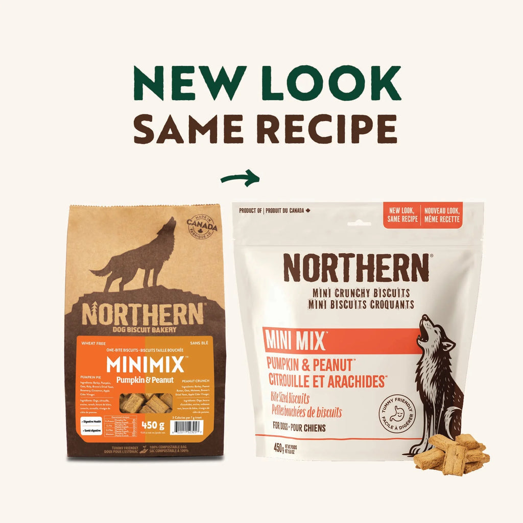 This flavourful Northern Biscuit vegan MiniMix pack combines best selling recipes, Pumpkin Pie and Peanut Crunch, to provide a delicious surprise with every bite. Baked in small batches with limited ingredients and the specially crafted Northern CRUNCH, Northern biscuits are naturally preserved and packaged in a 100% compostable bag. A mini version of the classic Northern biscuits, these crunchy treats are great for smaller dogs with little mouths and big hearts, and make for a great training treat at only 3 calories per 1g biscuit. Baked in Canada.
