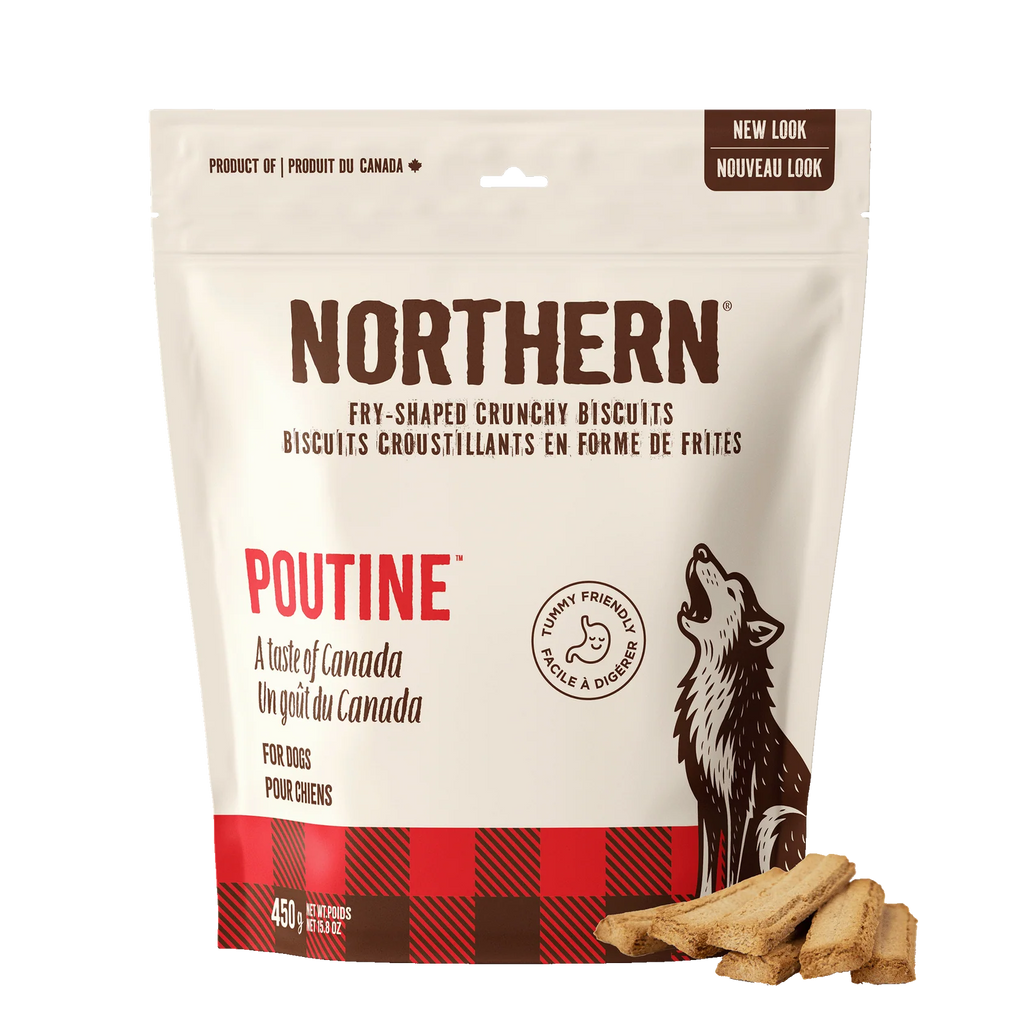 A play on the greatest Canadian delicacy of all time, Northern Biscuit's one of a kind Poutine biscuits are even shaped like fries! These tasty tributes to our homeland are baked with fresh, human-grade local Ontario chicken blended with standard poutine favourites of course; natural flavours of gravy and cheese. Baked in small batches with limited ingredients and the specially crafted Northern CRUNCH, Northern biscuits are naturally preserved and packaged in a 100% compostable bag. At only 9 calories per 3g biscuit, these biscuits are perfect for treating, rewarding and bonding with your dog. Baked in Canada.