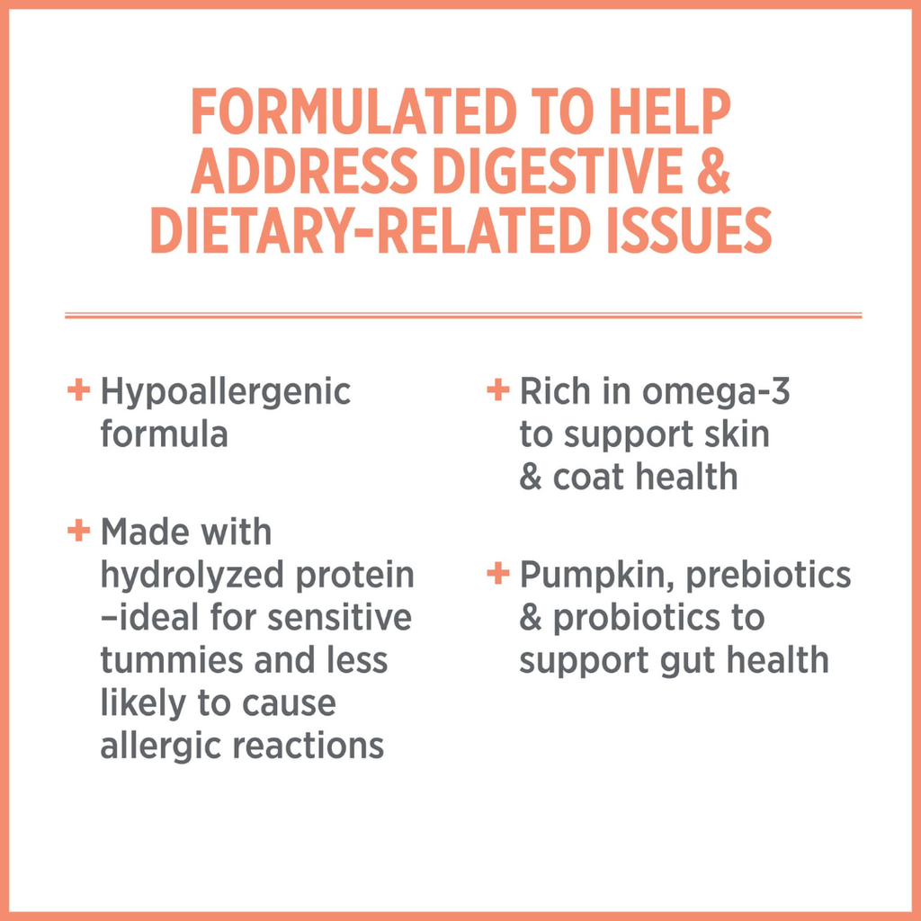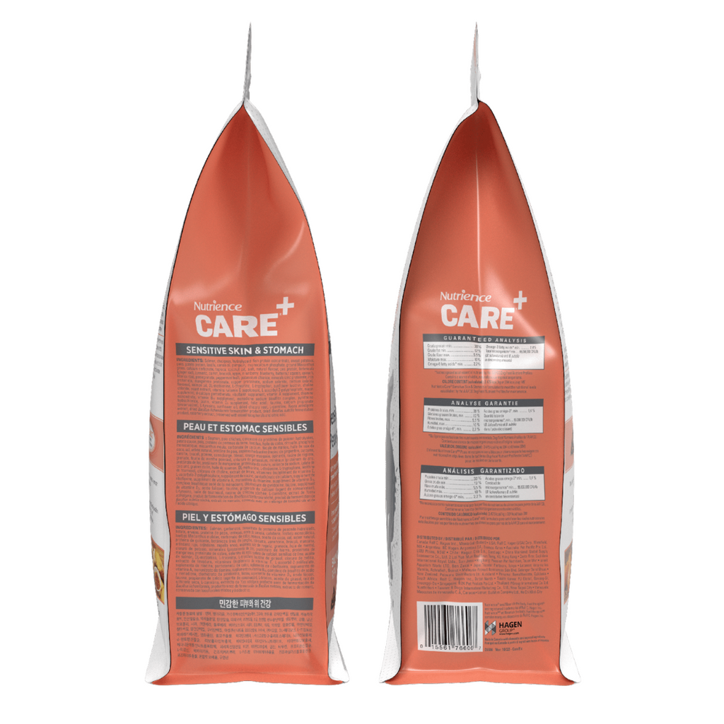 Nutrience Care Sensitive Skin & Stomach dog food is a limited ingredient, gluten-free diet specifically designed for dogs with food sensitivities or prone to digestive issues. This formula is free of all common allergens including chicken, beef, lamb, dairy products, eggs, meat meals, gluten, soy, and grains. This formula is made with a mix of fresh salmon – a novel protein, and hydrolyzed fish protein concentrate to reduce the chance of allergies and ease digestion. Hydrolyzed protein is great for pets with gastrointestinal sensitivities or who require a hypoallergenic diet.