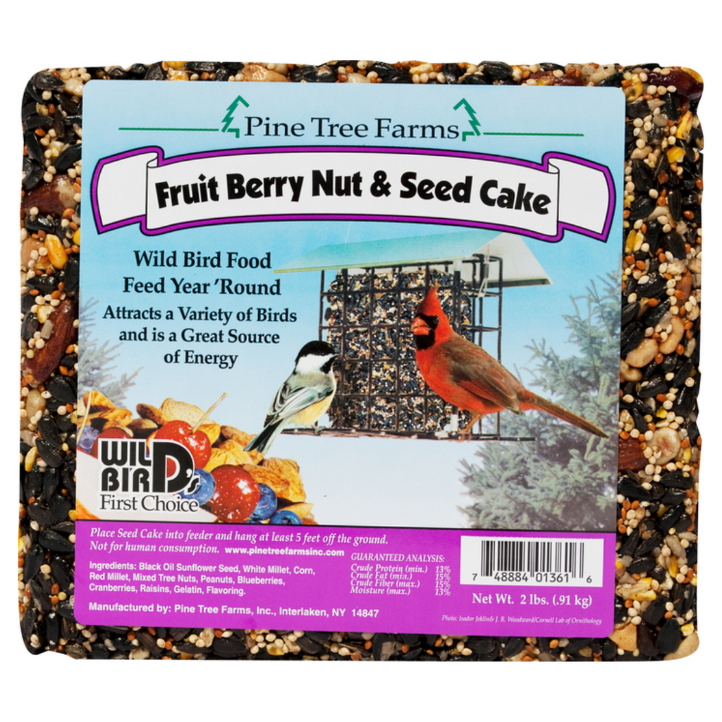 Pine Tree Farms' Large Seed Cakes are crafted for year-round feeding. Each cake features high-quality seeds and nuts to attract a diverse range of wild birds. The new vacuum packaging enhances freshness and extends shelf life.