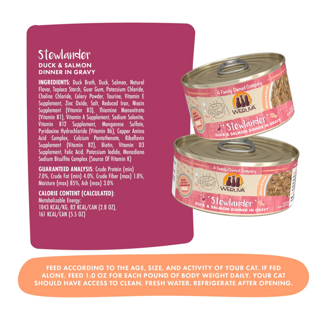 Duck Broth, Duck, Salmon, Natural Flavor, Tapioca Starch, Guar Gum, Potassium Chloride, Choline Chloride, Celery Powder, Taurine, Vitamin E Supplement, Zinc Oxide, Salt, Reduced Iron, Niacin Supplement (Vitamin B3), Thiamine Mononitrate (Vitamin B1), Vitamin A Supplement, Sodium Selenite, Vitamin B12 Supplement, Manganese Sulfate, Pyridoxine Hydrochloride (Vitamin B6), Copper Amino Acid Complex, Calcium Pantothenate, Riboflavin Supplement (Vitamin B2), Biotin, Vitamin D3 Supplement, Folic Acid, Potassium Iodide, Menadione Sodium Bisulfite Complex (Source Of Vitamin K).